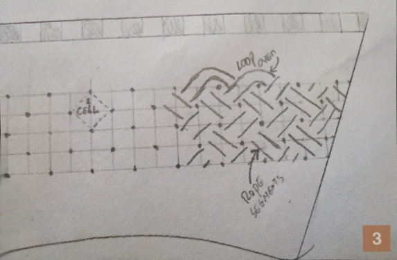 Since the mitered corner means that he grid is a little longer at the outside, the pattern gets disrupted at the joints, so I move back a cell. Then, after much fiddling around and erasing, I sketch in a transition pattern that allows the knot to continue flowing around the corner while maintaining the strict “over, under, over, under” sequence.