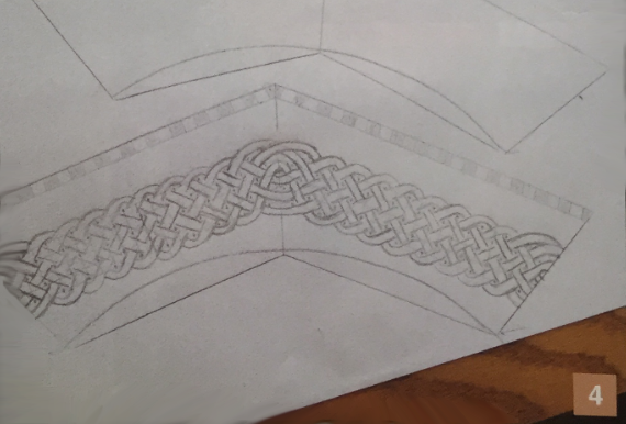 First, draw the knot. I trace a section of my clock frame onto a sheet of paper. I trace several sections, just in case I need to start over with a fresh outline.