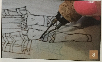 7 & 8. Continue burning lines to indicate the different elements in the image. Be sure to leave trailing lines as shown in Photo 8. Trailing lines give your viewer extra information about what she or he is looking at. It may be the muscular structure of the leg, a drapery fold, or a subtle change in direction. Be aware of these tiny details; they will take your burnings to an entirely new level.