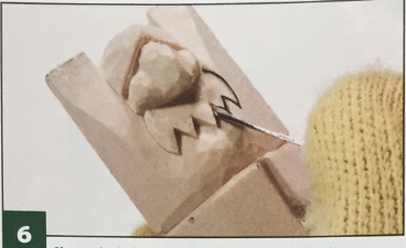 To make the project easy to hold (and to keep my fingers away from sharp tools), I start with a stick, carve the top, cut off the completed carving, and then move down the stick. These figures can be carved with just a knife, but I sometimes use a small V-tool to add texture.